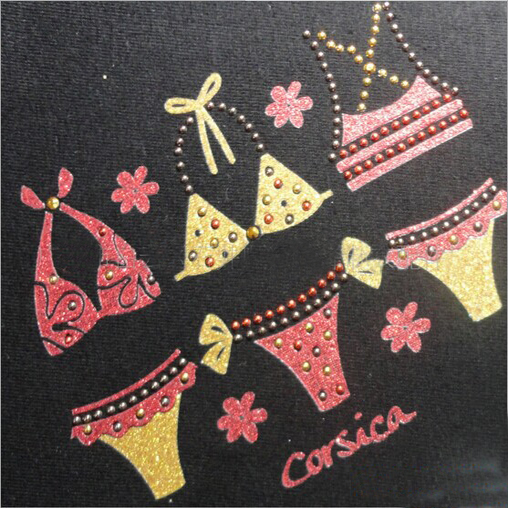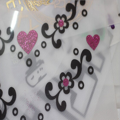 Glitter Heat Transfer has special effect. And it looks great. This printing style can make the logo or shape looks like the metal, and has shining effect. Widely used in woman's dress and children's wear.